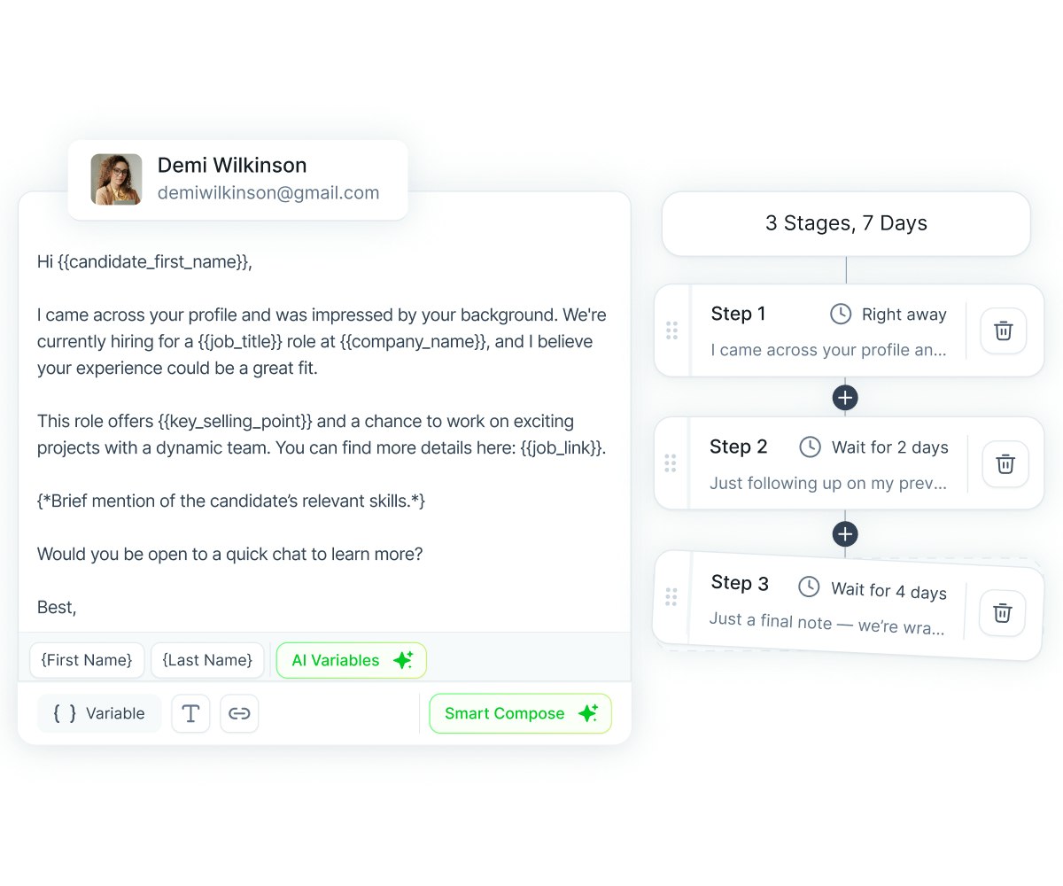 Whether you're reaching out to passive talent or staying in touch with warm leads, Wiggli sends personalized messages to the right candidates, at the right time using fully automated smart cadences that drive responses.