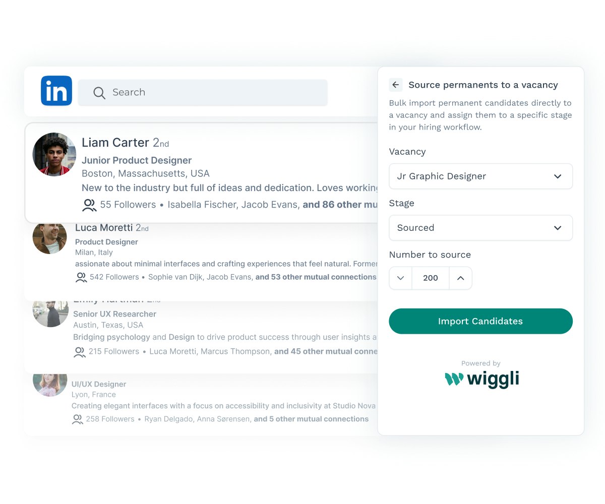 Like a profile on LinkedIn? Import up to 200 at once, straight into your vacancy in Wiggli ATS. Simple, instant, and ready to shortlist.