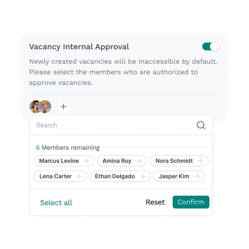 Design approval chains and role-specific hiring flows that reflect your org chart without relying on IT.