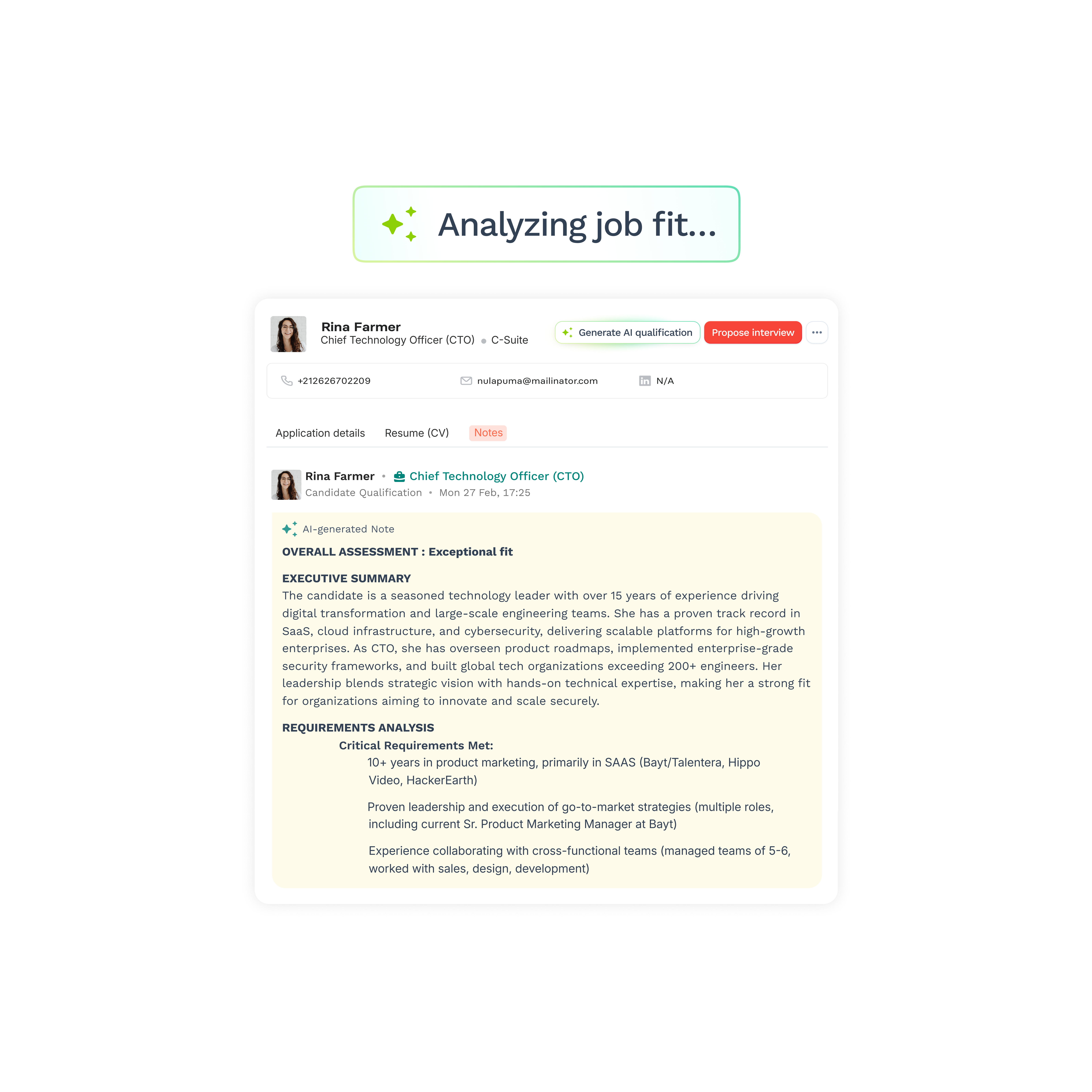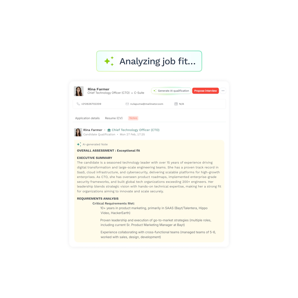 Contextual scoring across hard skills, experience, education, languages, and industry fit.
